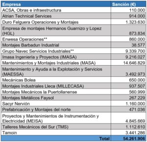 Redacción.- La CNMC desmanteló y sancionó al cártel organizado por 19 empresas de montaje y mantenimiento industrial, que fue creado para encarecer los servicios prestados fundamentalmente a empresas del sector energético y petroquímico, al acordar precios mínimos. Las sanciones al conjunto de las empresas se elevan a 54,26 millones de euros y, en el caso de los 8 directivos implicados, a un total de 280.500 euros.